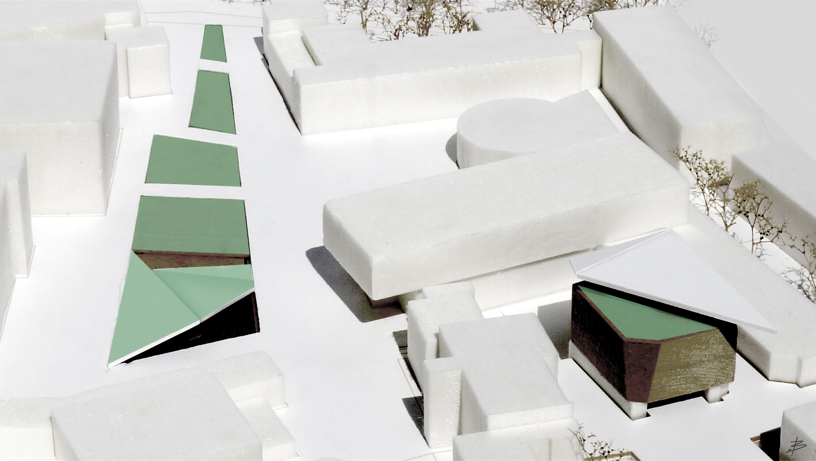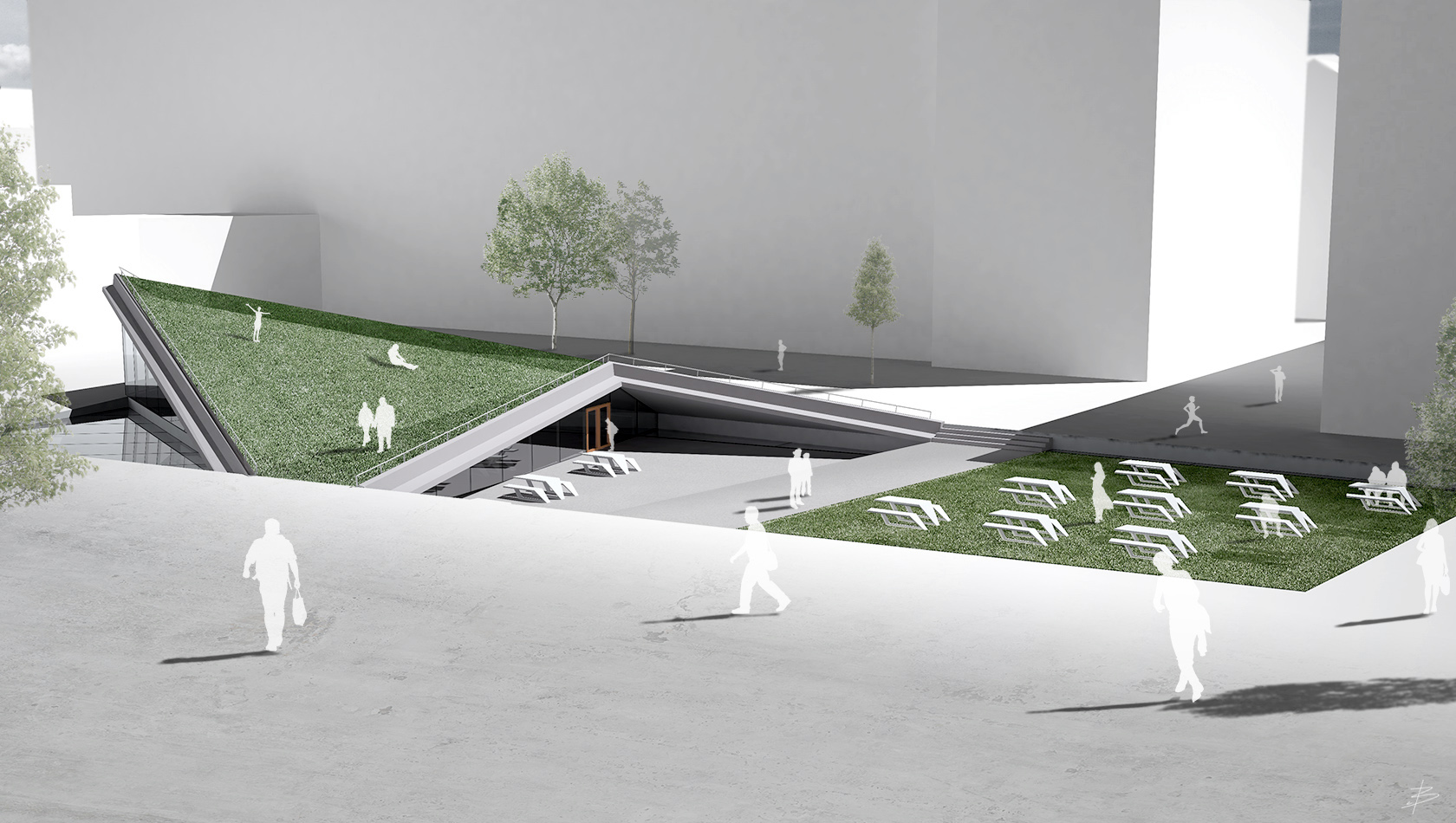 Dabei sollte die Tiefe des Platzes zurückgewonnen und die Weiträumigkeit nicht durch ein zentral platziertes Gebäude verhindert werden. Da eine Kindertagesstätte diese Anforderungen nicht erfüllen konnte, wurde sie an einem neuen und geschützten Standort geplant. Für den zentralen Platz wurde eine neue und sinnvolle Nutzung gesucht, die nicht oberirdisch aufbaut, sondern Bestandteil der Topografie wird. Vorgesehen wurde ein Grünstreifen, der zum einen die versiegelte Fläche entschärft und zum anderen das Entrée zum Campus bildet. Das neue „Grün“ lässt ein Stück Natur in das Campusgelände einziehen und lädt die Studierenden zum Verweilen ein. Dabei setzt sich der Grünstreifen Ebene für Ebene ab und mündet am Eingang zum neuen Auditorium & Café, welches nahezu vollständig unterirdisch angeordnet ist. Durch diese Anordnung bietet das Auditorium die optimale Nutzung für die Platzgestaltung. So wird gewährleistet, dass ein optimales Verhältnis zwischen Freifläche und Nutzfläche entsteht.
