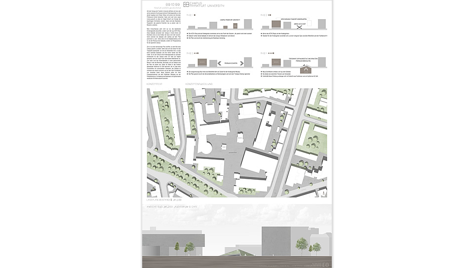 Das Konzept sieht vor, nicht nur den Anbau, sondern das gesamte Ensemble, bestehend aus der Kindertagestätte und dem ASTA-Shop, zu betrachten. Daher wurde zunächst der Abbruch des Ensembles vorgesehen, denn die sehr zentrale und prominente Lage des Gebäudes wirkte eher wahllos. Die Position dieser Bebauung ließ sich allerdings mit der Historie der Infrastruktur begründen, denn sie orientierte sich einst an einer Straße, die nach dem Umbau des Campus nicht mehr vorhanden ist. Somit konnte im Sinne einer städtebaulichen Reparatur das Ziel nicht nur die Planung eines Gebäudes lauten, sondern die ganzheitliche Betrachtung des Campus und der Platzgestaltung.